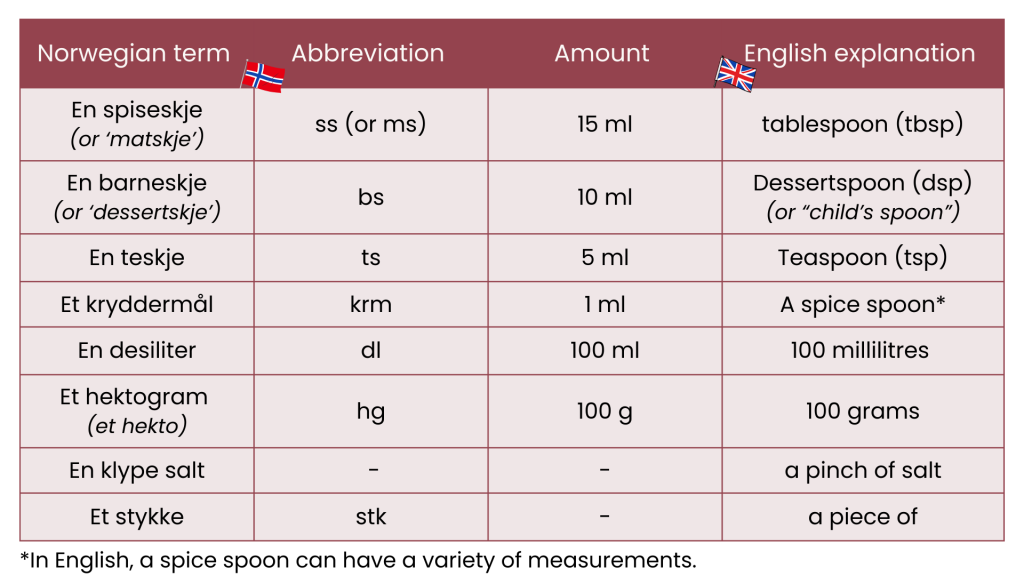 When you look up a recipe, the first thing you usually find is a list of ingredients and how much of each ingredient you need. Already at this stage, you might find it difficult to understand what is meant. For example, what does “2 ts salt” mean? Well, “ts” stands for “teskje” (teaspoon) and is, for most people, the smallest spoon we use in our everyday life. Abbreviations and measurement units that differ from those in other languages can be useful to get an overview of, so we have put together a small list for you here: