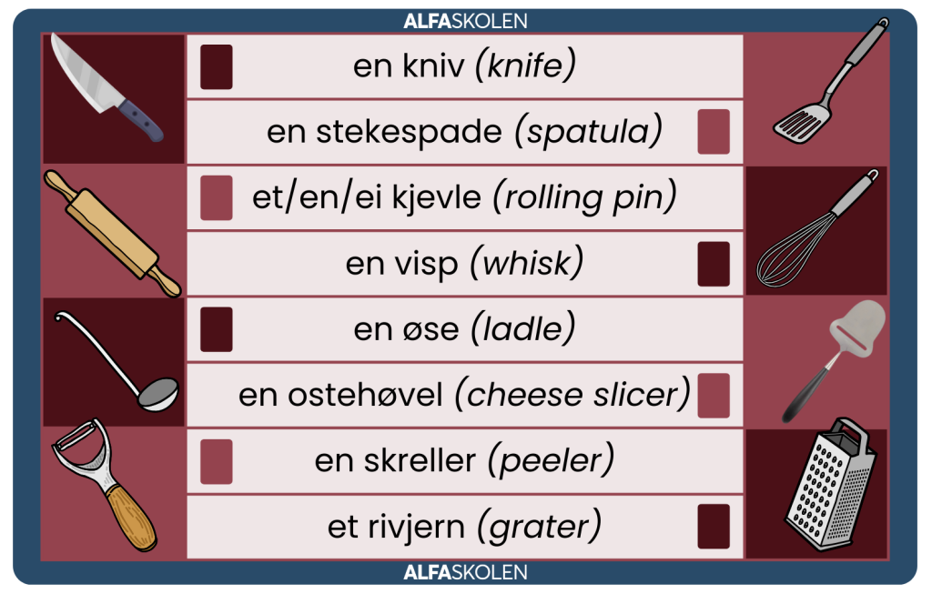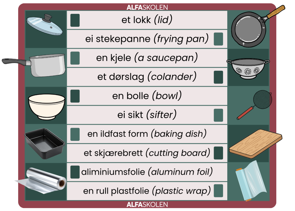 | et lokk (lid) | en ildfast form (baking dish) | et/en/ei kjevle (rolling pin) |