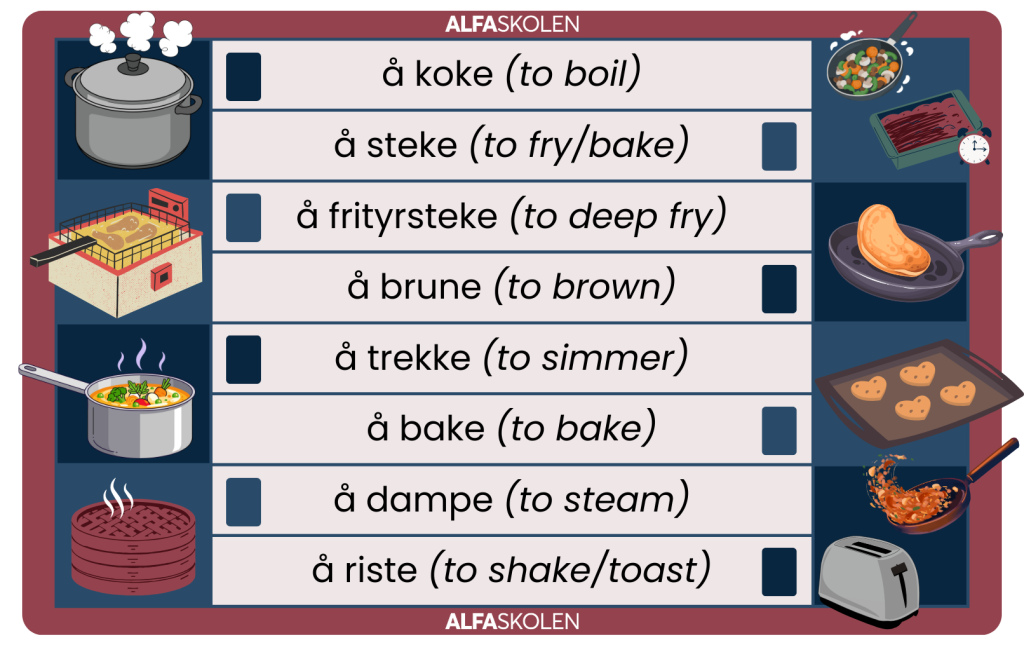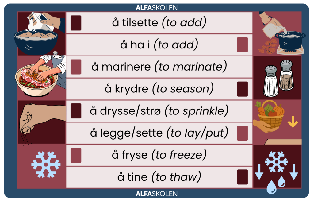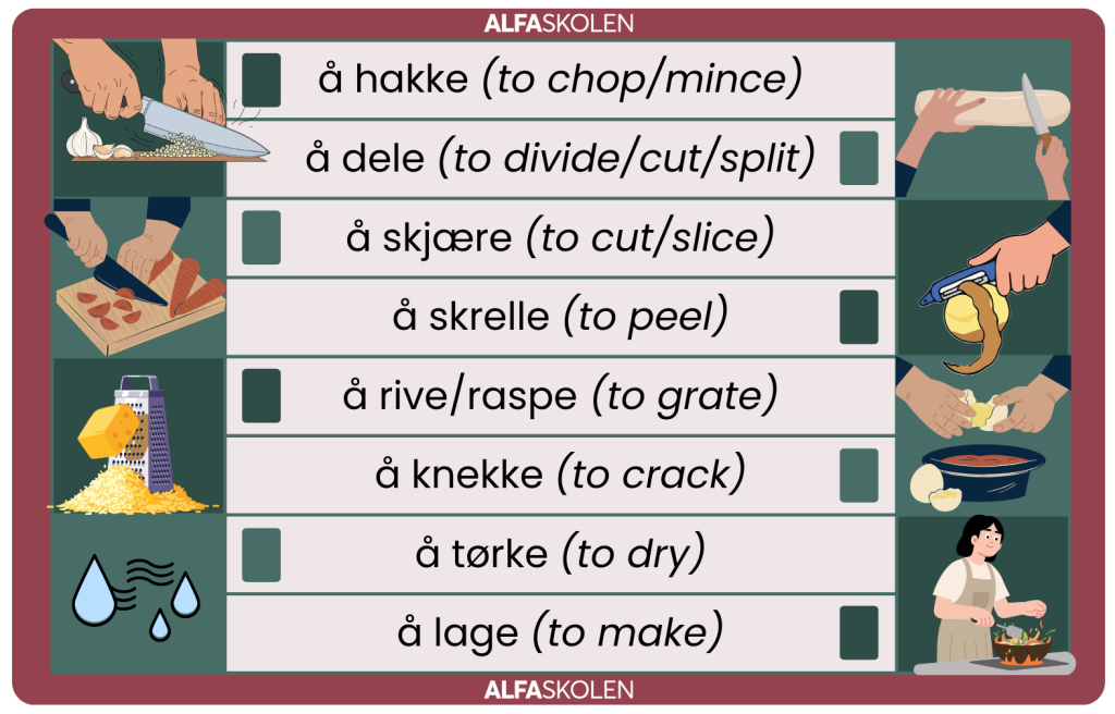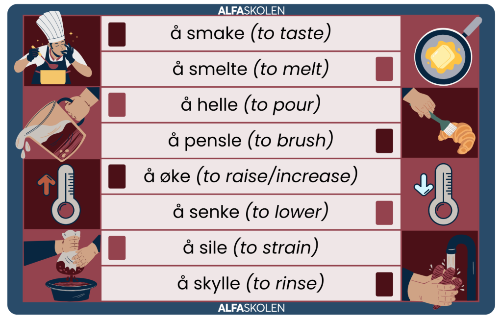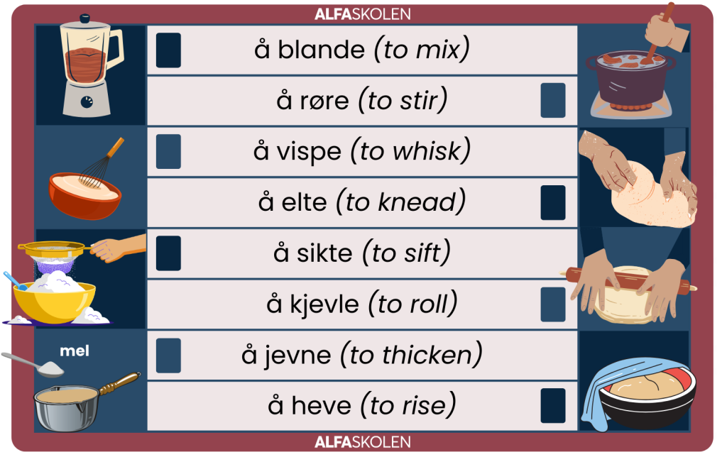 | å helle (to pour) | å marinere (to marinate) | å vispe (to whisk) | å frityrsteke (to deep fry) | å skjære (to cut/slice) |