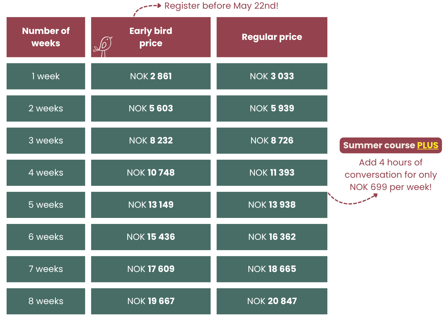 When signing up for a course, please indicate your Norwegian level in the comments. After confirming your registration on our website, summer course participants will receive an online placement test via email. This test is mandatory for those enrolling in levels above A1 (new beginners). Your course level will be determined based on the test results and discussions with you. We advise visiting the school the week before your course starts to complete the test.