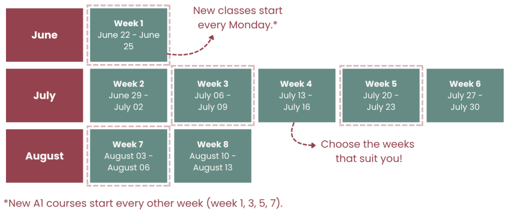 In 2025, Summer Courses will be offered in the weeks below as either morning sessions (09:00 – 13:00) or afternoon sessions (12:15 – 16:15).