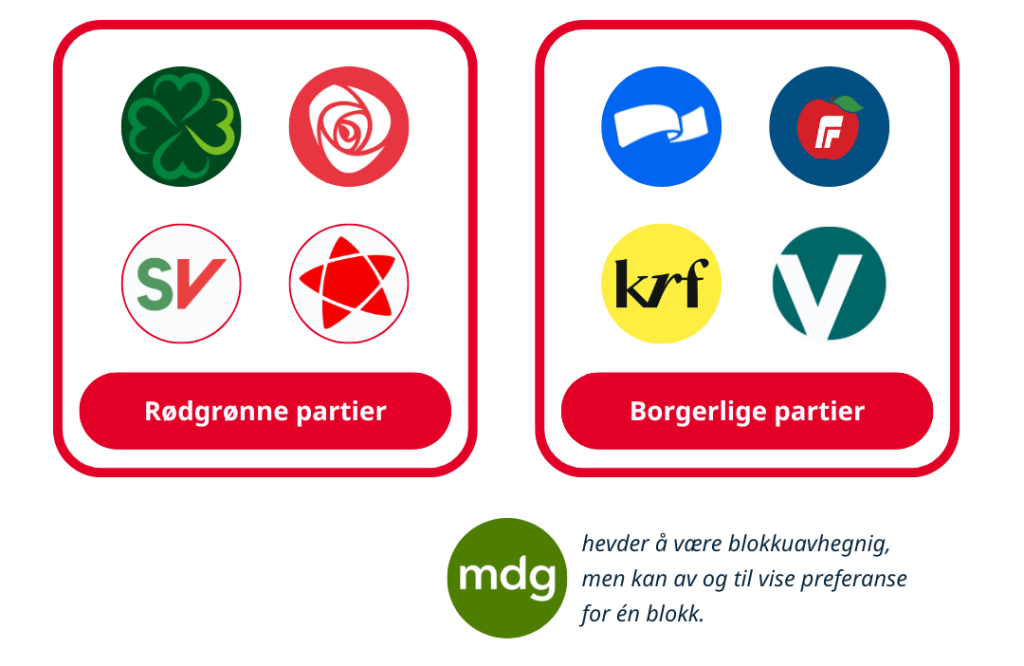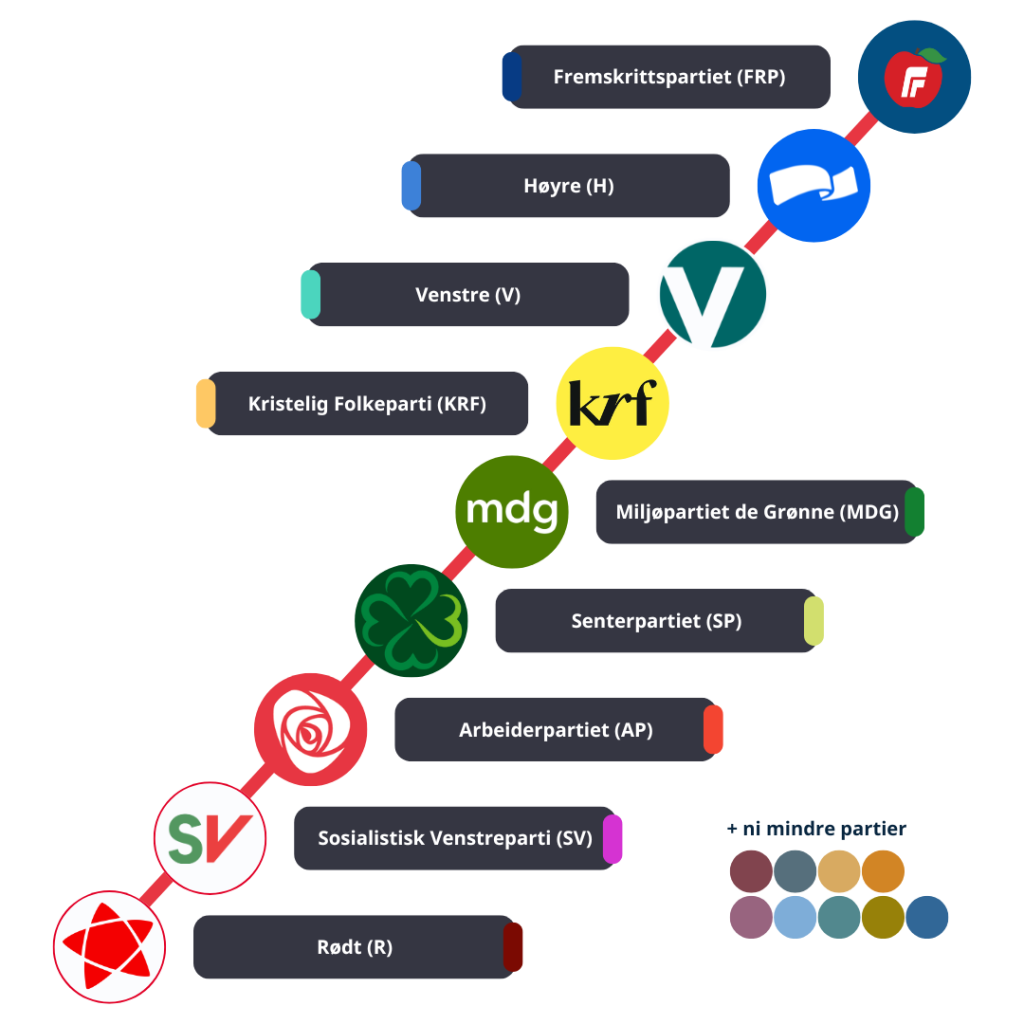 - Rødt (R): Redusere forskjeller og styrke rettigheter for arbeidstakere og vanlige folk.