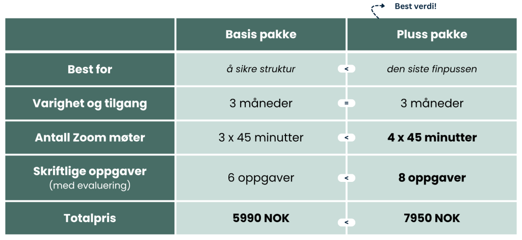 Basis- og plusspakken er dine to hovedvalg. For de som ønsker å starte forsiktig, kan du kjøpe Basispakken først og senere oppgradere (1960 NOK). Oppgraderingen inneholder den nøyaktige differansen (1 ekstra Zoom-sesjon og 2 skriftlige oppgaver) og sikrer at du får den fulle verdien av Pluss-pakken når du trenger det mest.