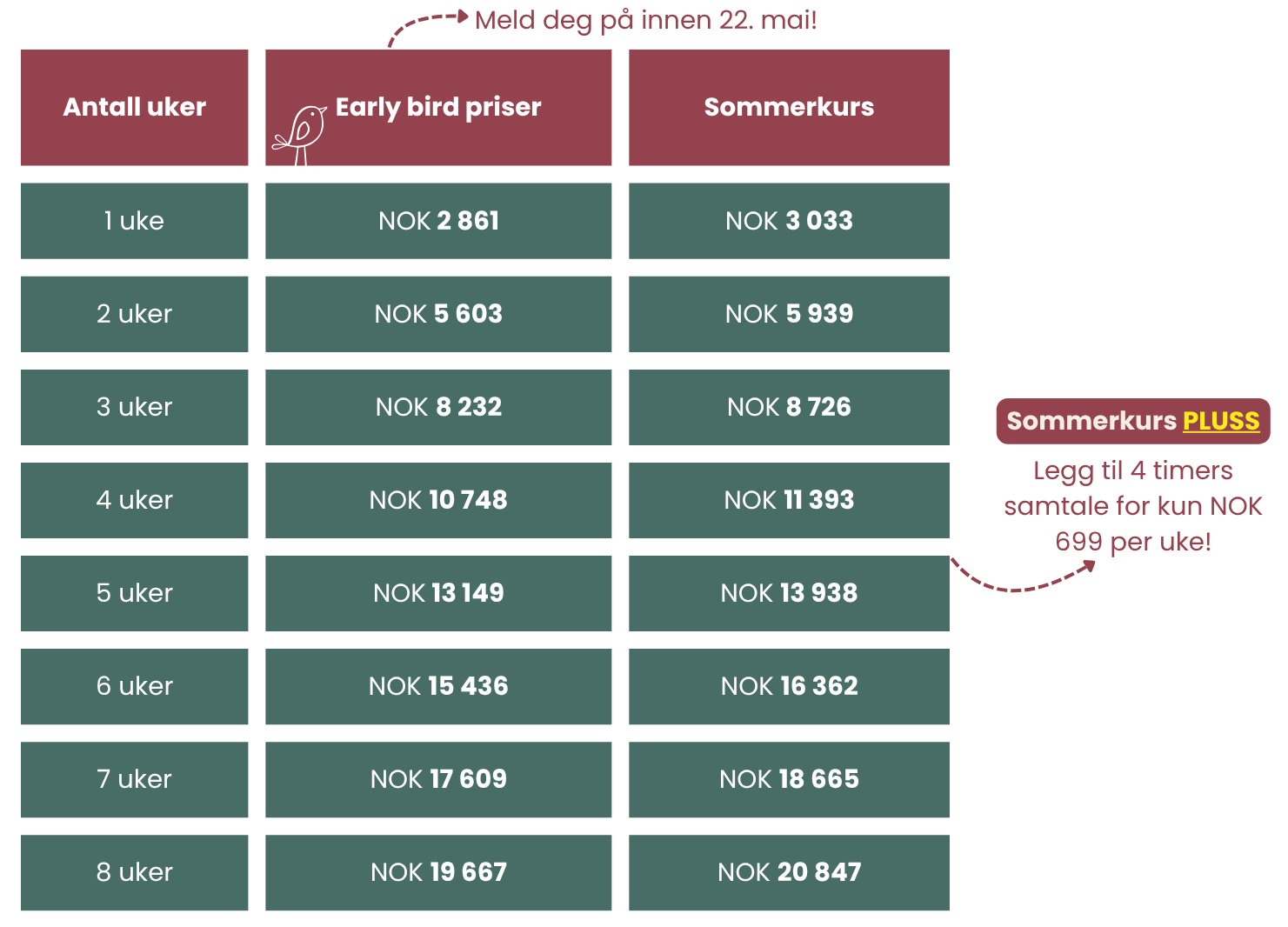 Våre sommerkurs er utviklet og designet med sikte på den perfekte balansen mellom lek og effektiv læring, slik at du kan få mest mulig ut av norskkurset ditt.