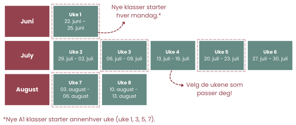 Alfaskolen tilbyr norskkurs i de populære sommermånedene fra slutten av juni til august. Sommerkursene er fleksible og tilgjengelige i totalt 8 uker. Hver uke teller som et eget kurs, og du velger selv hvor mange uker du ønsker å delta på.