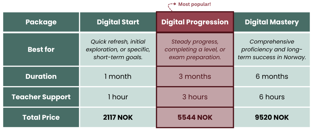 If you’re applying for permanent residency or Norwegian citizenship, our Skilled Workers courses can be used toward your official language requirements — with the right combination of self-study and Zoom lessons.